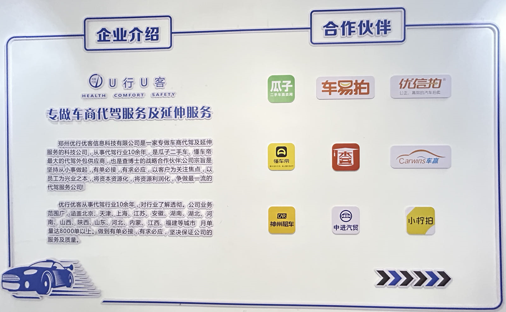 优行优客信息科技有限公司是一家专做车商代驾及延伸服务的科技公司,是瓜子二手车、天天拍车最大的代驾外包供应商,也是查博士的战略合作伙伴;公司的宗旨是坚持从小事做起,有单必接,有求必应,以客户为关注焦点,以员工为兴业之本,将资本资源化,将资源利润化,争做最一流的代驾服务公司!